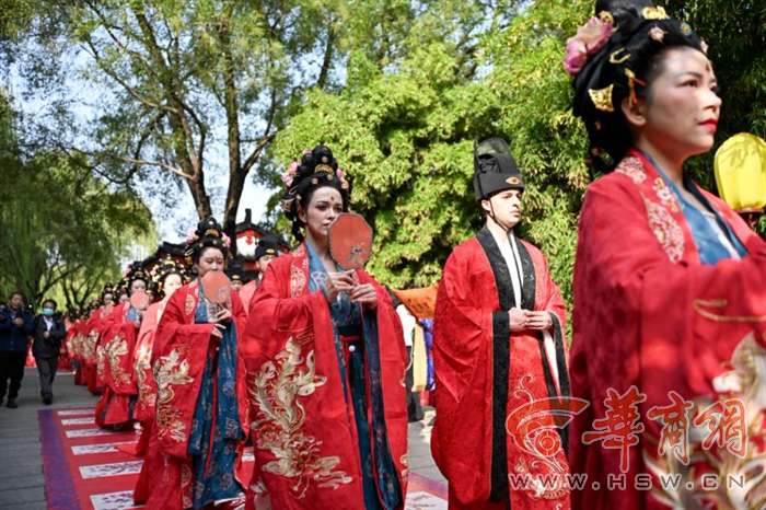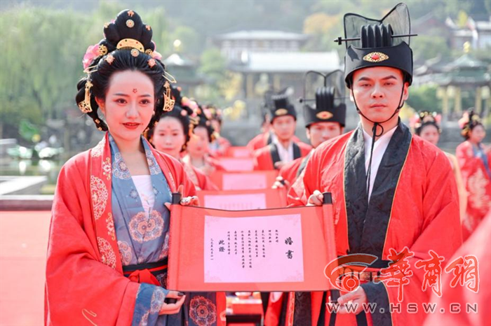 此次活动吸引30余对嘉宾参与体验,有来自全国各地的爱侣,还有来自泰国、俄罗斯、巴基斯坦等国家热爱中国传统文化的朋友。嘉宾身着精心复原制作的唐装华服,化精致唐妆,体验唐代婚仪。却扇、沃盥、拜天地、同牢、合卺、共结镜纽等富有文化内涵的仪式,让参与者深刻感受到中华传统文化的博大精深。