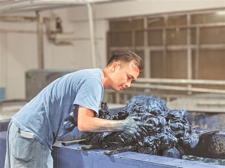杨从森将布料放入染缸浸染(受访者供图)